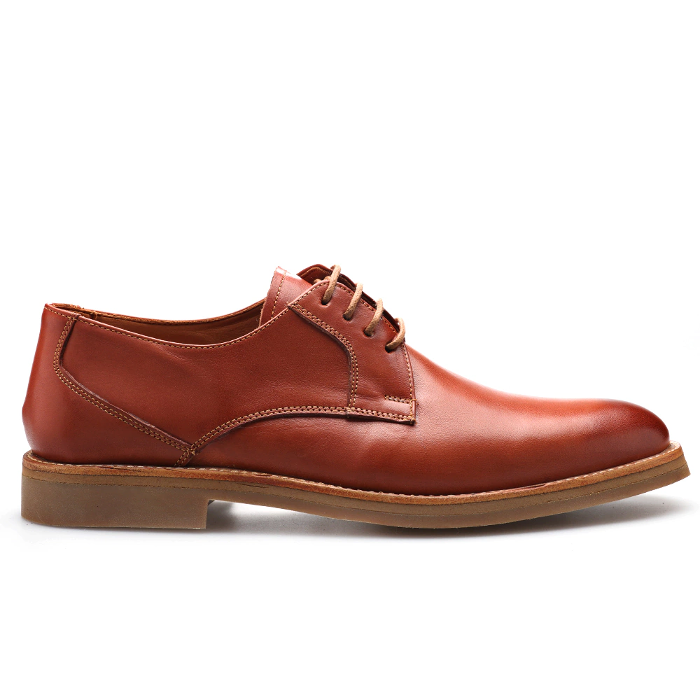 Art. 121/124. Zapato urbano acordonado confeccionado en cuero vacuno de suave textura. El cuero es trabajado a través de un proceso de brush off (quemado) que le da un efecto bi tonal. La suela es de caucho y la vira de cuero vacuno. El matizado puede variar de acuerdo a la partida, ya que es un proceso netamente artesanal y manual.