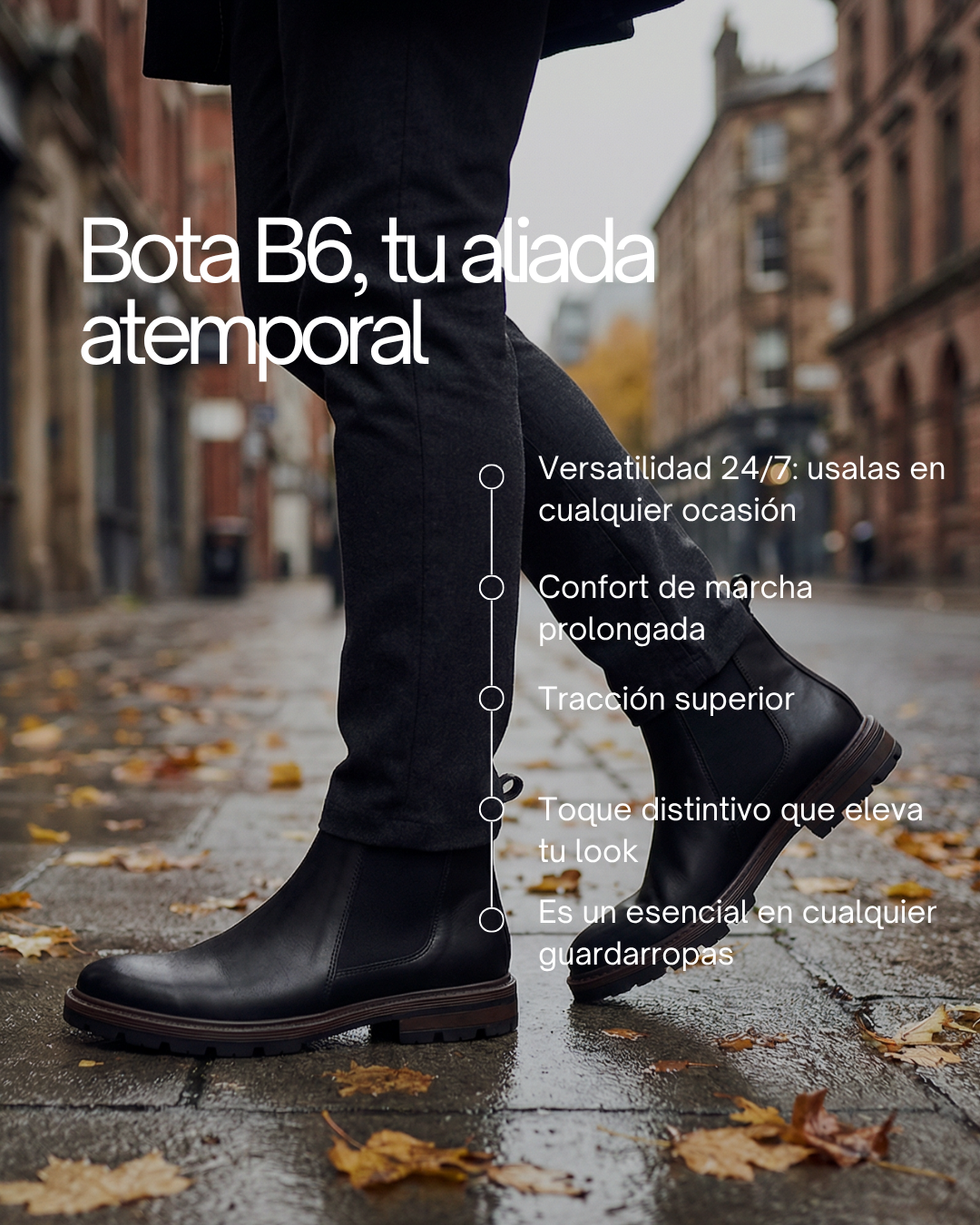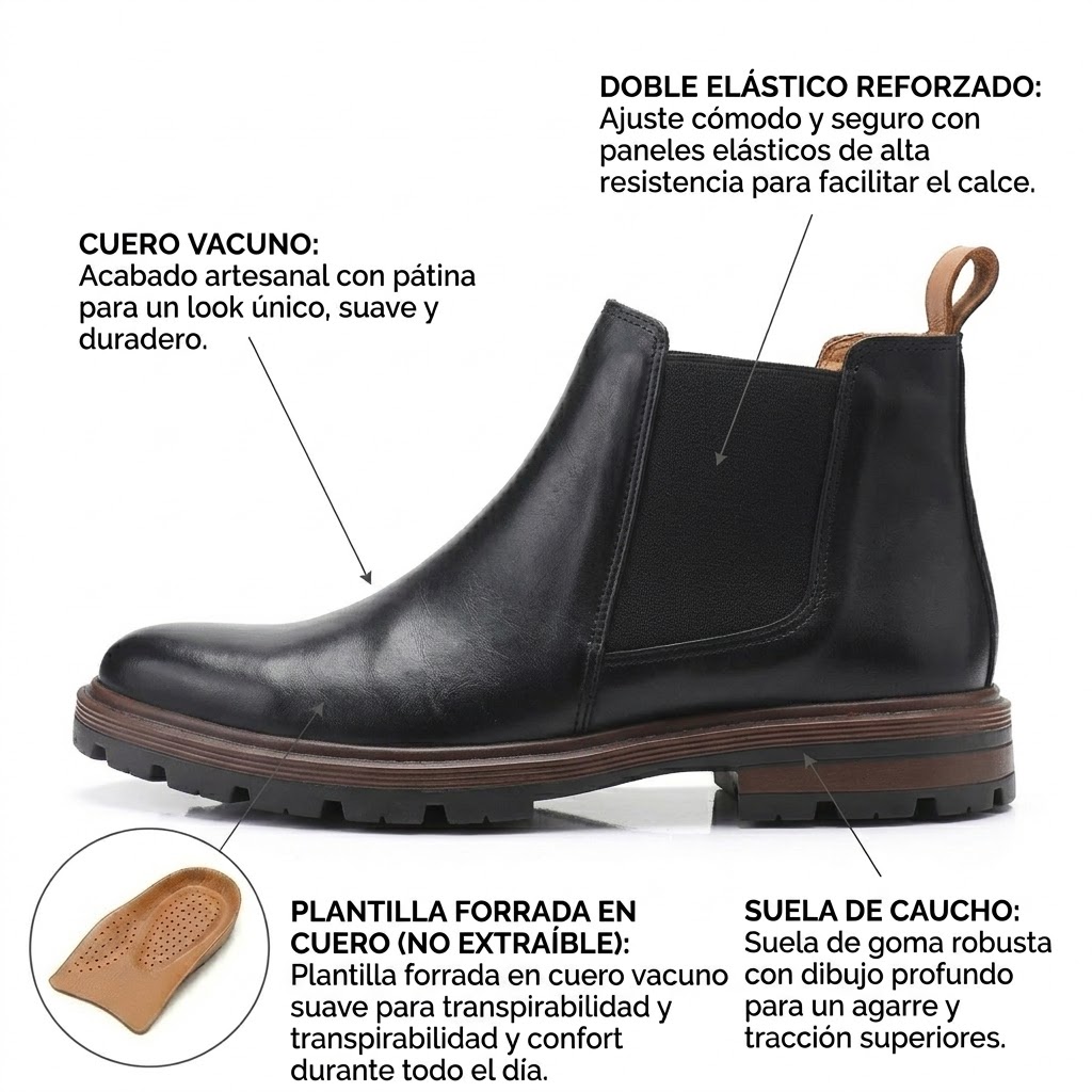 La Bota B6 es una bota Chelsea que combina diseño clásico y funcionalidad. Fabricada en cuero de alta calidad, cuenta con doble elástico lateral para un calce práctico y seguro. Su suela de goma tipo ruta brinda máxima adherencia y resistencia, ideal para el uso diario en la ciudad o para escapadas de fin de semana.