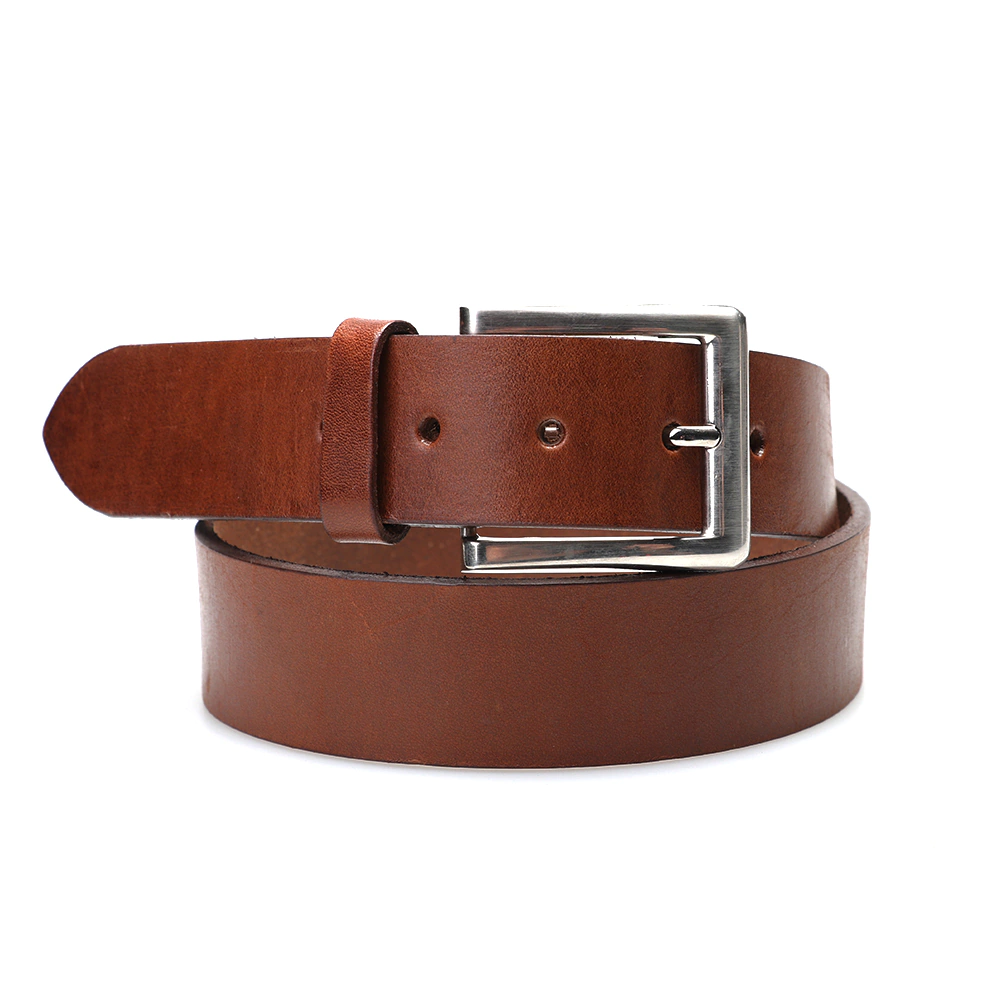 Cinturón grueso en cuero vacuno forrado en cuero con hebilla metálica.