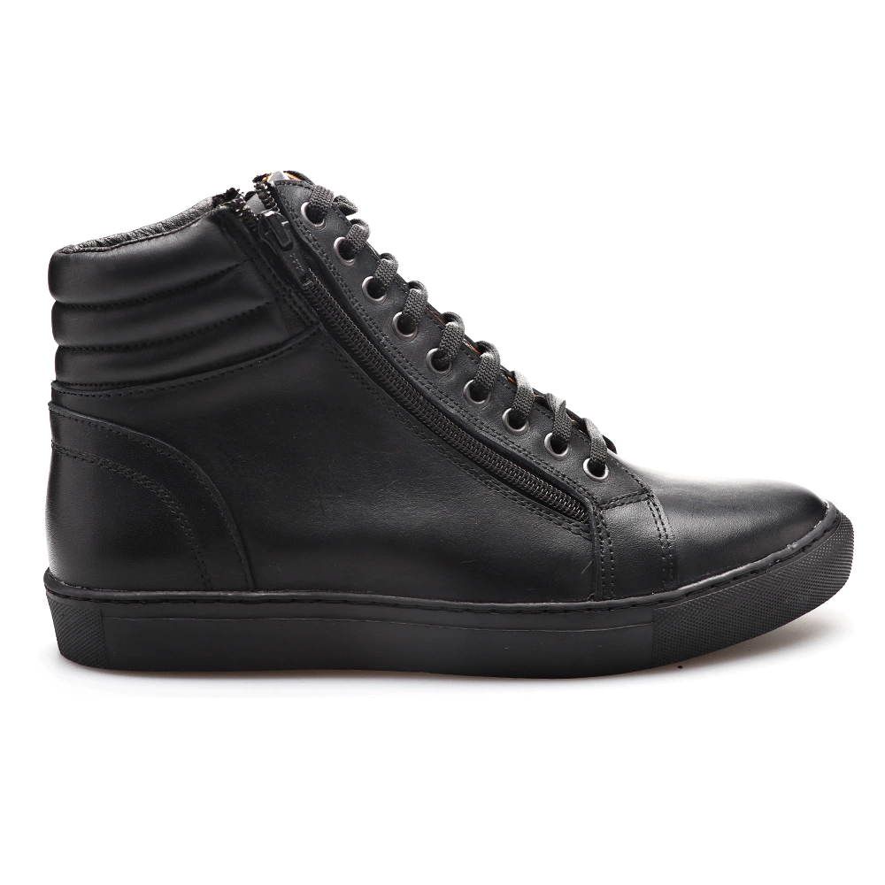 Zapatilla botita urbana confeccionada en cuero vacuno con suela de goma. El acceso es mediante cordones y cierre.