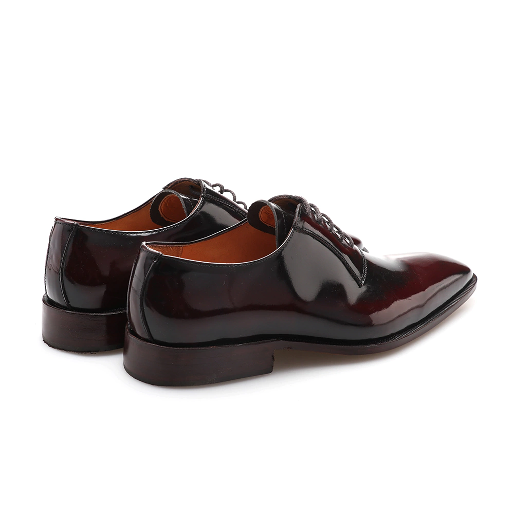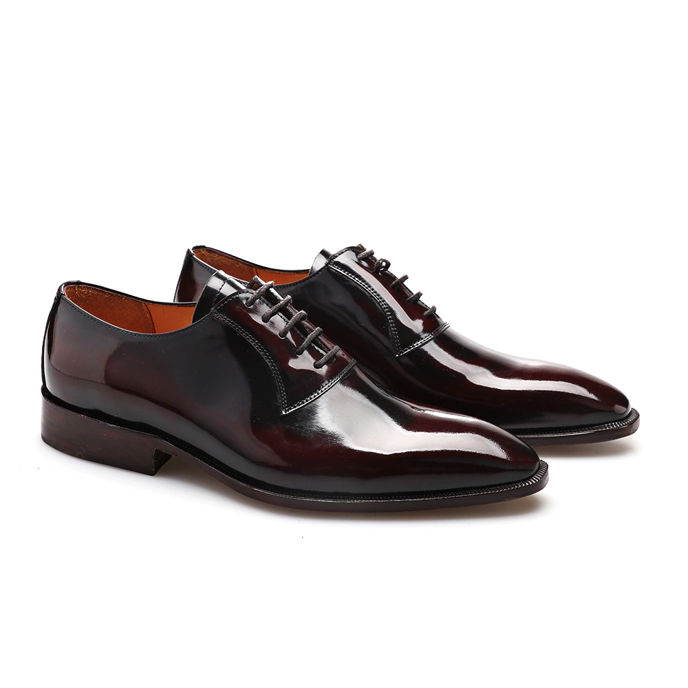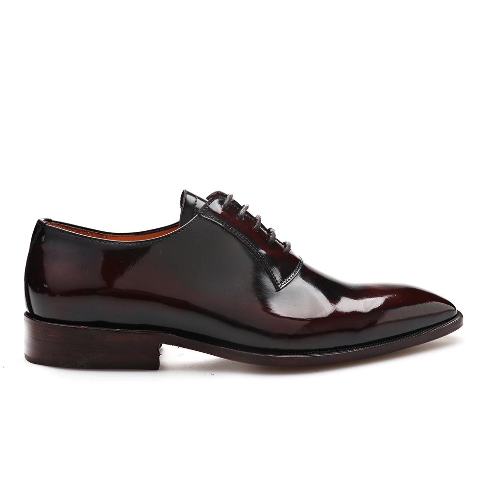 Zapato prusiano confeccionado en charol rubí, sobre suela arteanal de cuero. La horma es en punta estilo italiano. Posee media plantilla de cuero.