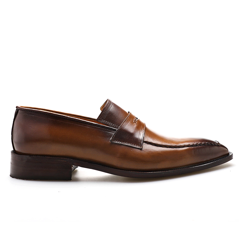 Solo disponible online y en Av. Santa Fe 1325. Mocasín confeccionado en cuero vacuno de suave textura con trabajo artesanal de brush off que le da un efecto bi tono. Elaborada sobre una horma italiana de punta estilizada y moderada.