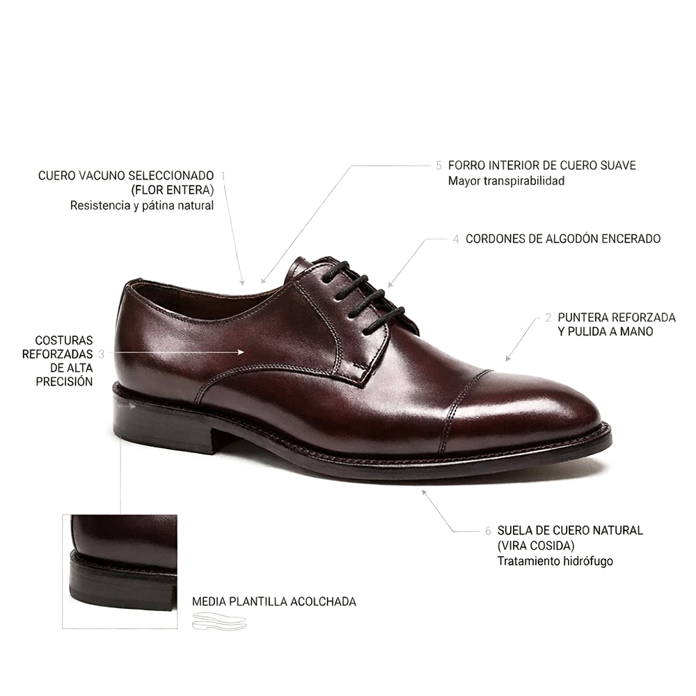Cada par de estos calzados es único, gracias a las sutiles variaciones de tono e imperfecciones naturales del cuero, que realzan su carácter exclusivo y artesanal.